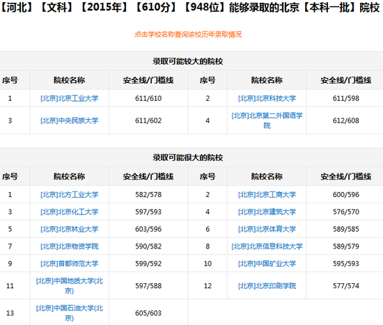 推薦考生和家長使用新浪高考志愿通卡的根據分數/位次選學校功能,先對志愿填報有個初步的準備。比如上述那位考生,河北文科考生,幾次模擬考試下來,分數都在610分左右,高考發揮比較正常,大學想到北京讀書。通過高考志愿通卡查詢到(點擊此處),被錄取可能性較大的院校有北京工業大學(分數線,專業設置)、中央民族大學(分數線,專業設置)等4所院校;被錄取可能性很大的院校有13所院校,包括北京工商大學、首都師范大學、中國石油大學(北京)等。
