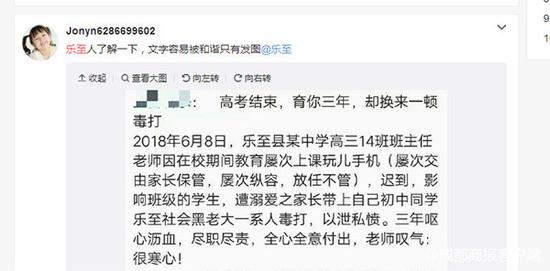 成都商報6月10日消息,8日,有網貼稱,因在校期間管教了上課耍手機、在校談戀愛的違紀學生,四川資陽市樂至中學一名班主任在高考結束當晚,接到同是教師的學生家長邀約后,被學生家長帶來的人暴打。