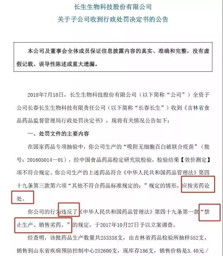7月19日晚間,長生生物發(fā)布公告稱,其子公司長春長生生物科技有限責(zé)任公司(下稱“長春長生”,長春長生生物科技有限責(zé)任公司是上市公司長生生物科技股份有限公司全資子公司)收到了《吉林省食品藥品監(jiān)督管理局行政處罰決定書》。