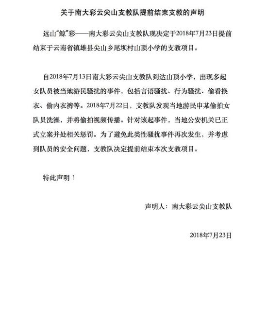 據南大彩云支教團的招募廣告介紹,該團是掛靠在南京大學公益學院的一個公益性組織,每年會招募一些志愿者前往云南省鎮雄縣進行支教活動。目前,該支教團的志愿者每年都要在鎮雄縣尖山鄉山頂小學進行支教活動。7月23日,南大彩云支教通過官方微信公眾號發布了“關于南大彩云尖山 支教提前結束支教的聲明”,內容為“遠山‘鯨’彩——南大彩云尖山 支教隊現決定于2018年7月23日提前結束于云南省鎮雄縣尖山鄉尾壩村山頂小學的支教項目。自2018年7月13日南大彩云尖山 支教隊到達山頂小學,出現多起女隊員被當地游民騷擾的事件,包括言語騷擾、行為騷擾、偷看換衣、偷內衣褲等。2018年7月22日,支教隊發現當地游民申某偷拍女隊員洗澡,并將偷拍視頻傳播。針對該起事件,當地公安機關已正式立案并處相關懲罰。為了避免此類性騷擾事件再次發生,并考慮到隊員的安全問題,支教隊決定提前結束本次支教項目。