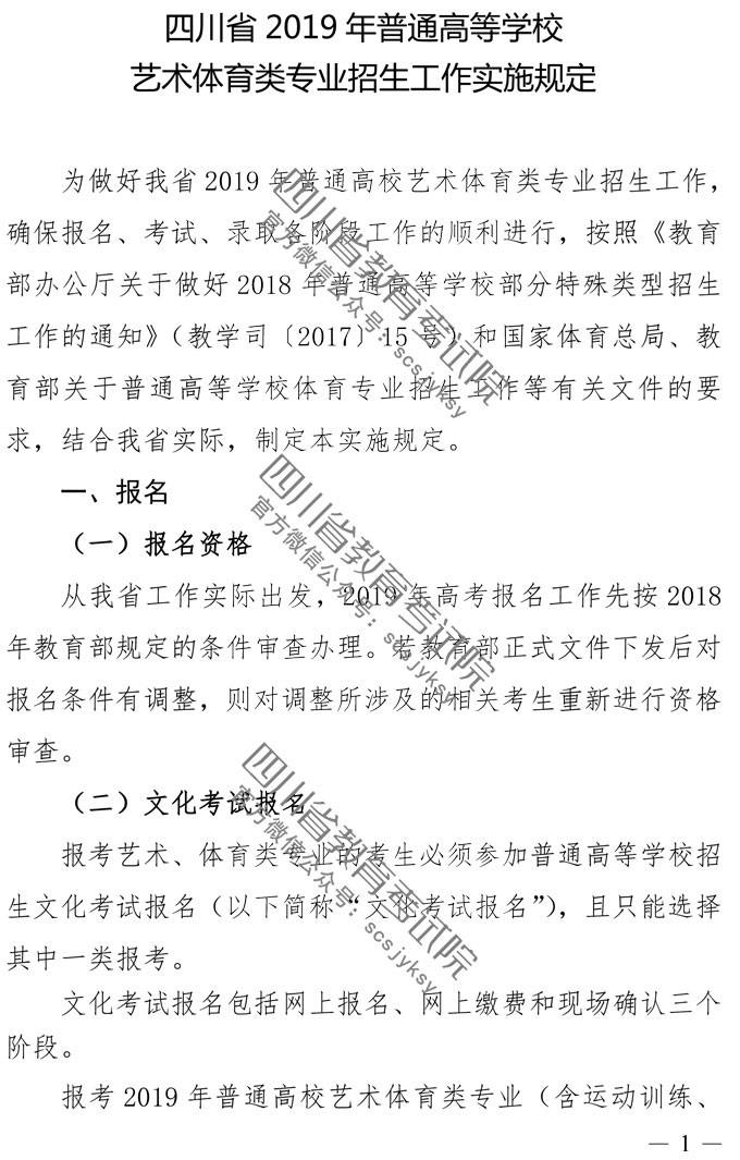 四川省2019年普通高等學校藝術體育類專業招生工作實施規定