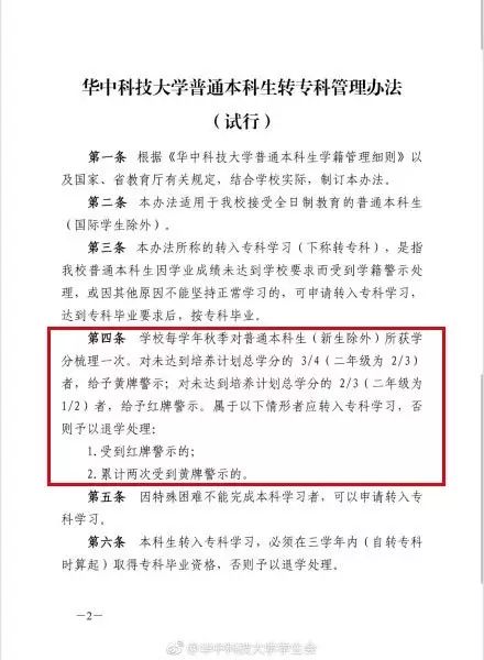 一次紅牌警示,或者兩次黃牌警示就得轉入專科,否則予以退學處理。第十條規定,轉入專科學習期間不得轉回本科,也不得轉專業。