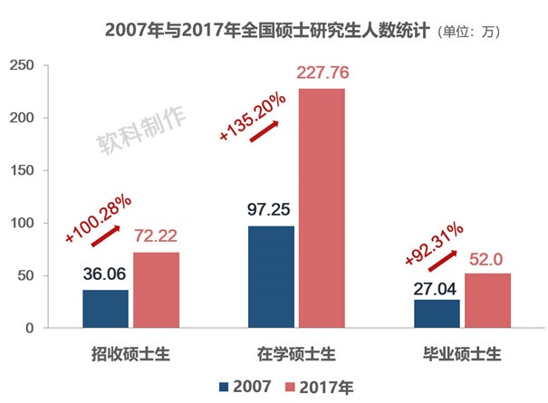 那么,在考研報名人數持續走高的同時,高校是否也在進行研究生擴招呢?教育部《2017年全國教育事業發展統計公報》顯示,2017年研究生招生80.61萬人,其中招收碩士生達72.22萬人;在學研究生263.96萬人,其中在學碩士生227.76萬人;畢業研究生57.80萬人,其中畢業碩士生52.0萬人。對比2007的統計數據,招收碩士生人數增長了100.28%,在學碩士生人數增長率高達135.20%,畢業碩士生人數也增長了92.31%,三者幾乎都實現了翻倍式增長。