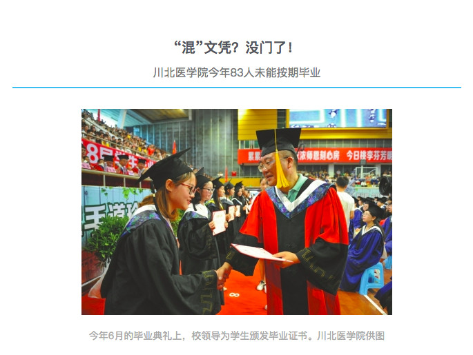 “初入大學,聽學長們說,畢業證隨便拿,放心耍就是了!”這是真的嗎?據華西都市報報道,由于學業成績沒有過關,川北醫學院今年有83名學生未能正常畢業,這在學院67年辦學史上是第一次出現。