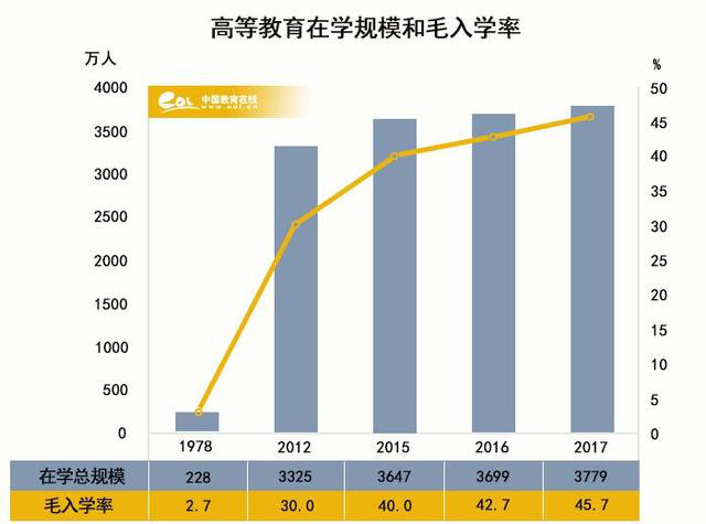 據(jù)統(tǒng)計(jì),截止2017年,全國高等教育在學(xué)總規(guī)模1達(dá)到3779萬人,絕對(duì)數(shù)量居世界第一;40年,毛入學(xué)率2從2.7%到45.7%,超過中高收入國家平均水平6個(gè)百分點(diǎn)。