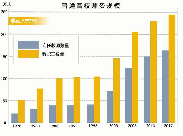 隨著高等教育事業(yè)的發(fā)展,我國普通高等學(xué)校師資隊(duì)伍也在不斷擴(kuò)大。全國普通高等學(xué)校教職工人數(shù)從1978年的51.8萬人增至2017年的244.3萬人。