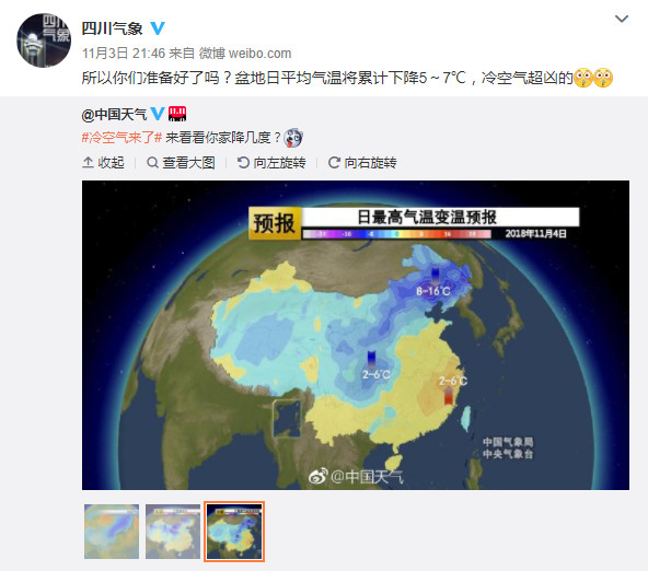 劇透一下,一直到7日,冷空氣都不會(huì)離開,這幾天盆地最高氣溫或低至12℃,與前兩日相比直降10℃以上。較強(qiáng)冷空氣席卷全國(guó) 昨日成都已提前感受