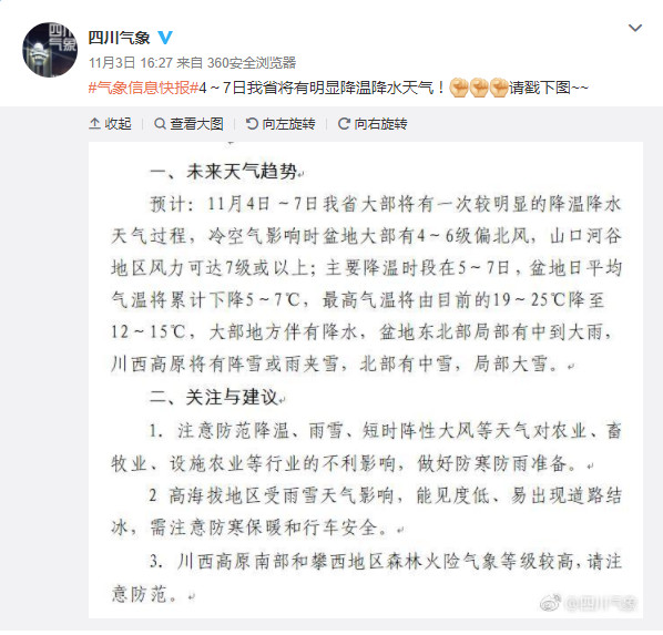 據(jù)四川省氣象臺(tái)預(yù)報(bào),11月4日-7日,我省將有一次較明顯的降溫,主要降溫時(shí)段在5-7日,盆地日平均氣溫將累計(jì)下降5-7℃,最高氣溫將由目前的19-25℃降至12-15℃。