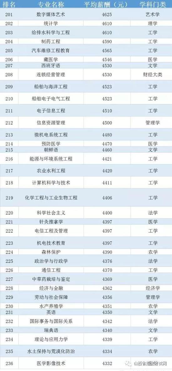 剩下的專業薪酬排名,9000元以上的專業共有5個,7000元以上的專業共有20個,反而百來個專業的平均薪酬都集中在4000~6000元。可見,各大專業畢業生的平均薪酬幾乎在這個區間上下浮動,你在平均值上,還是下呢?不妨來看看“2017中國236個專業平均薪酬大排行”。