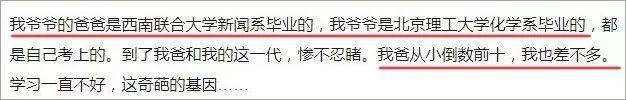 每個(gè)小孩都是神仙發(fā)到每家每戶(hù)的植物種子。神仙心情好的時(shí)候,會(huì)根據(jù)你的家庭基因情況,有針對(duì)性地發(fā)。心情不好的時(shí)候,也許就瞎發(fā)八發(fā)。因?yàn)榉N子的分發(fā)比較隨機(jī),所以,人世間常常會(huì)有不可理解的事情發(fā)生。有時(shí)候,同一個(gè)爹媽?zhuān)绺绻缘孟窆恚艿芷さ孟窆贰S袝r(shí)候,爹媽都是學(xué)霸,生個(gè)小孩是班里墊底的學(xué)渣。比如這個(gè):