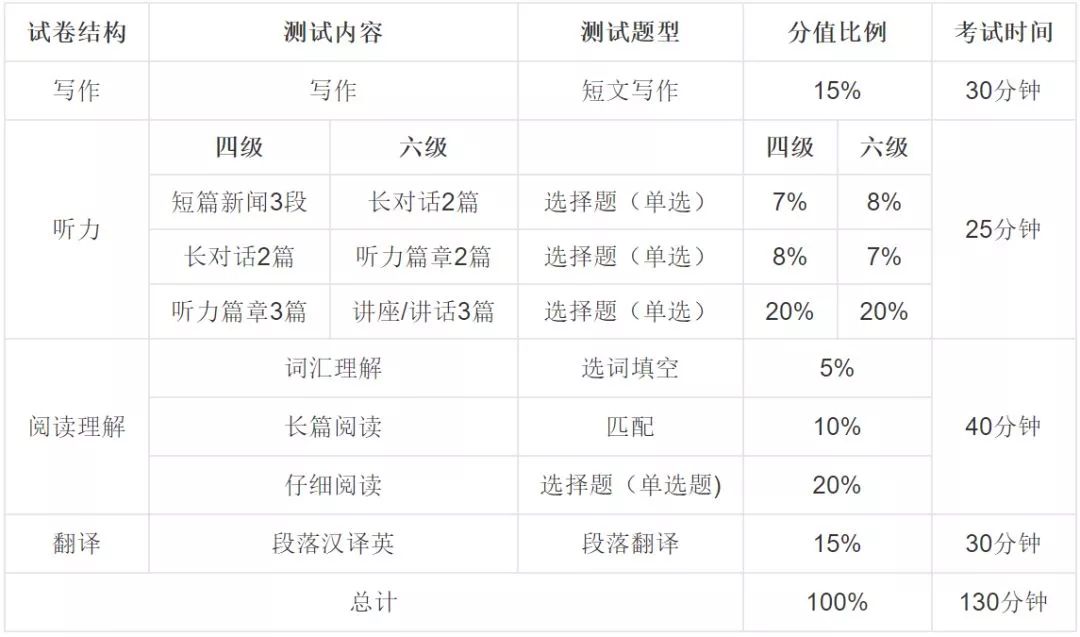 先提醒一下大家四六級考試時間和各個題型所占比例,了解了這些,才好對癥下藥!攻克薄弱項!