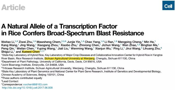 6月29日,我校水稻研究所陳學偉教授團隊在Cell雜志(2016年SCI收錄影響因子達30.41)發(fā)表了題為“A Natural Allele of a Transcription Factor in Rice Confers Broad-Spectrum Blast Resistance(一個轉(zhuǎn)錄因子的天然變異賦予水稻對稻瘟病的廣譜抗性)”的研究論文(我校為通訊單位、水稻所陳學偉教授為通訊作者,李偉滔副研究員、碩士研究生朱紫薇、加州大學戴維斯分校Mawsheng Chern博士、我校水稻所尹俊杰博士、碩士研究生楊超和冉莉為共同第一作者)。該研究通過大數(shù)據(jù)分析與遺傳、生化、病理等實驗方法和技術(shù)手段相結(jié)合,挖掘了對稻瘟病的新型廣譜高抗的水稻遺傳資源,闡明了新型廣譜持久抗病的分子機理。為水稻稻瘟病廣譜抗病育種提供了重大理論和應(yīng)用基礎(chǔ),也為小麥、玉米等糧食作物相關(guān)新型抗病機理的研究和應(yīng)用提供了重要借鑒。據(jù)悉,該論文是繼中科院植物所種康研究組在Cell發(fā)表文章闡明水稻感知寒害的分子機制之后我國水稻領(lǐng)域的第二篇Cell論文,同時也是西南地區(qū)的第一篇Cell論文。祝賀陳學偉教授及其領(lǐng)導的團隊,同時也祝賀四川農(nóng)業(yè)大學作為 主要完成單位首次在CNS主刊論文上取得突破。
