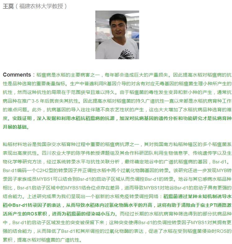 而陳學偉研究團隊經(jīng)過多年的研究,發(fā)現(xiàn)的水稻天然變異位點——編碼C2H2類轉(zhuǎn)錄因子的基因Bsr-d1的啟動子,其作用正是可以有效提高對稻瘟病的抗病免疫能力,這一位點是水稻本身存在的,純天然的,不是外在的導入變異,這非常罕見。這個具有稻瘟病廣譜持久抗性的水稻天然變異點的發(fā)現(xiàn)可以說為防治稻瘟病提供了全新路徑,如果把目前廣泛使用的抗病基因方式比作“服預(yù)防藥式”防治,那么天然變異位點的方式則可稱為“提高免疫水平式”的防治,應(yīng)用到實際生產(chǎn)中,可培育具有廣譜抗病能力的品種,將在保證品質(zhì)、產(chǎn)量的同時,大幅度提高水稻對稻瘟病的抵抗力,并將有效避免病源菌進化導致的抗病能力失效的問題,有效減少農(nóng)藥使用,非常符合生態(tài)綠色環(huán)保的需求。題,有效減少農(nóng)藥使用,非常符合生態(tài)綠色環(huán)保的需求。