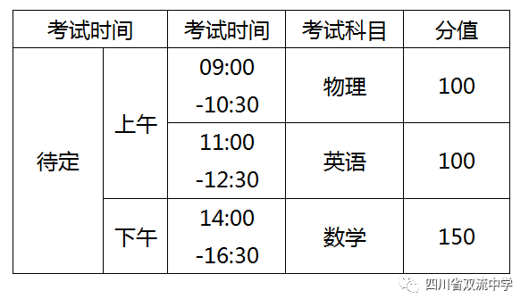 特別說明:請考生和家長密切關注雙流中學官方網站、學校微信公眾號,學校將通過官方網站、官方微信平臺等方式告知確切的考試時間。