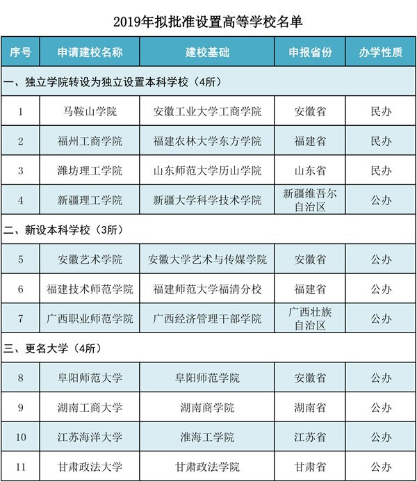 教育部擬批準設置11所高校:3新設4轉設4更名