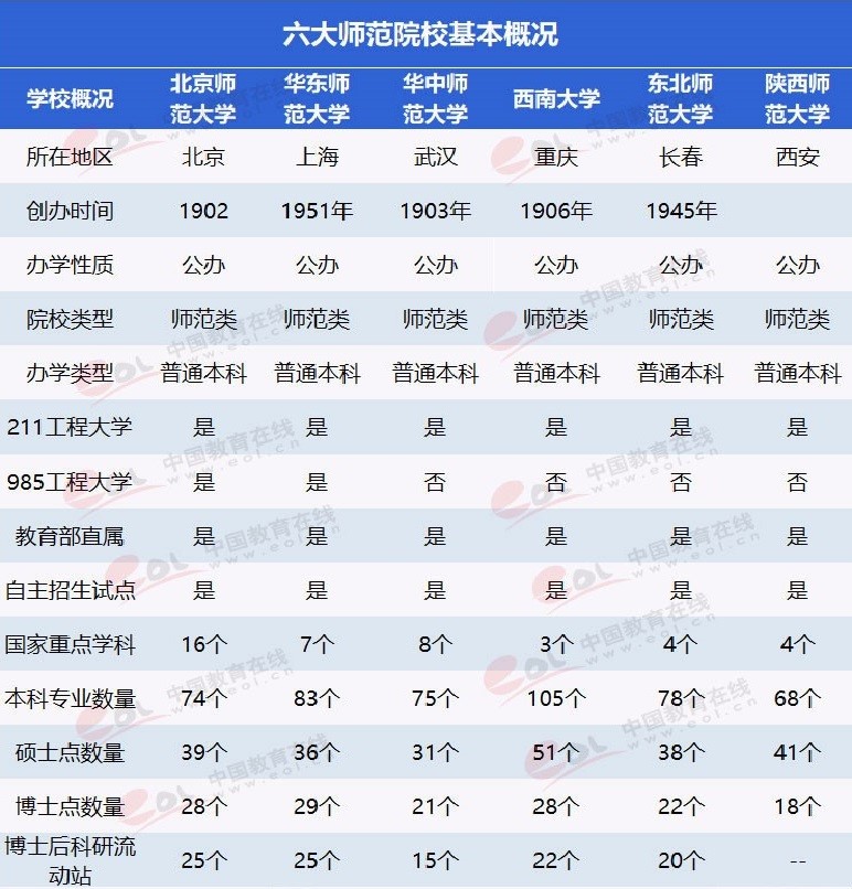 這六所教育部直屬的師范大學都是實力派院校,也都入選了“雙一流”名單,其中北京師范大學和華東師范大學入選世界一流大學建設高校;華中師范大學、東北師范大學、陜西師范大學、西南大學(原西南師范大學)入選世界一流學科建設高校。做為師范院校的領頭羊,它們各有各的優勢: