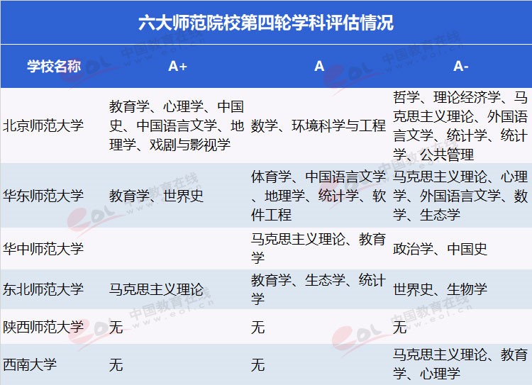 在教育部第四輪的學科評估中,北京師范大學共有15個學科進入A類,其中A+學科有6個;華東師范大學有12個學科進入A類;陜西師范大學沒有學科進入A類,與其他五所院校存有一定差距。