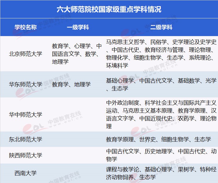 從各高校入選“一流學科“數量來看,北京師范大學共有11個,遙遙領先其他5所高校。其次是東北師范大學6個,華東師范大學3個,華中師范大學2個,西南大學和陜西師范大學分別為1個。
