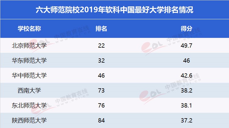在最新發布的2019年軟科中國最好大學排名中,各校排名總體均居于全國高校前列,其中北京師范大學排名第22位,總分49.7,在六大師范院校中處于相對領先的地位。