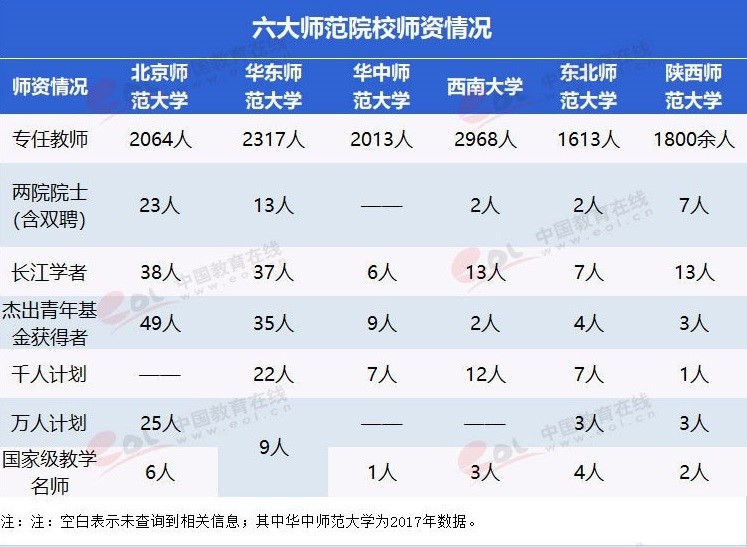 高水平的師資隊伍是衡量一所高校實力的重要標準,也是提升一所高校核心競爭力的關鍵環節和重要突破點。這六所師范院校擁有高水平的師資力量,六所學校共擁有兩院院士47人,長江學者、杰出青年學者、萬人計劃入選者百余人。