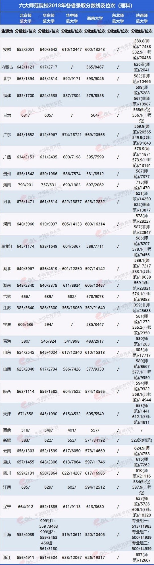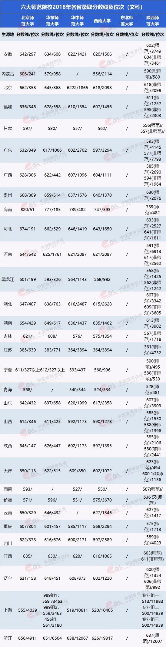 從已經公布的錄取分數上來看,北京師范大學在各地錄取分數線最高,西南大學和陜西師范大學相對較低。