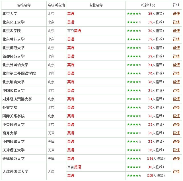 推薦專業源自高校學生實名推薦數據。當前累計投票數量超過423萬人次。通過實名注冊的高年級學生或畢業生,根據本校各專業辦學情況進行投票,推薦優勢專業或特色專業。下圖僅展示了部分高校英語專業推薦情況,星號為推薦指數。