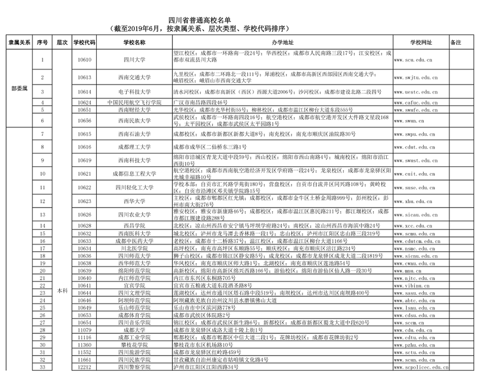 四川省126所普通高校名單校代碼和地址
