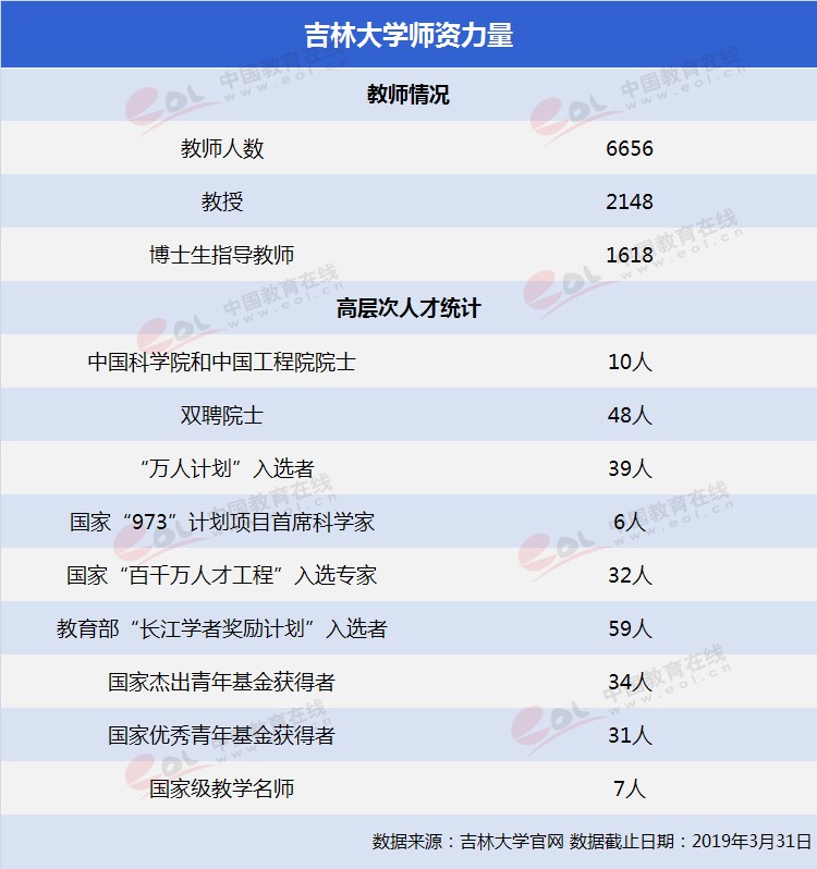 吉林大學師資力量雄厚,有教師6656人,其中教授2148人,博士生指導教師1618人。