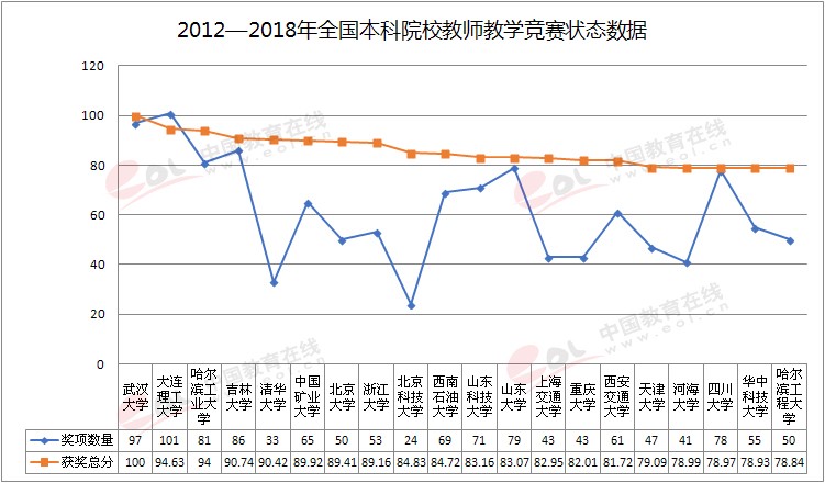 中國高等教育學會“高校競賽評估與管理體系研究”項目組發(fā)布的“2012-2018年全國高校教師教學競賽狀態(tài)數(shù)據(jù)”中,吉林大學教師競賽獲獎數(shù)量86項、獲獎總分90.74分,在數(shù)據(jù)采集的759所高校中位列全國第4位。