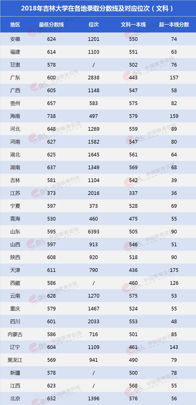 從2018年吉林大學錄取線高出重點線分值統(tǒng)計來看:文科有11個省份錄取線超重點線80 分及以上;理科12個省份錄取線超重點線120 分及以上。在吉林省文科錄取最低分為581分,超出重點線39分,省內排名1104;理科類錄取最低分588分,省內排名7623名,超出重點線55分。