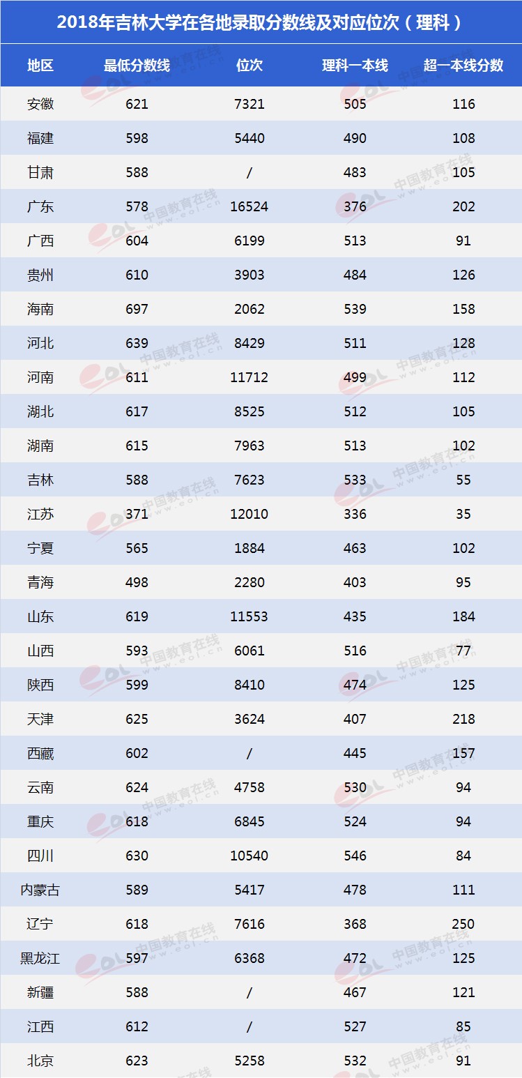 以下是關于吉林大學2018年在各地錄取最低分數(shù)線及對應位次,供考生參考。
