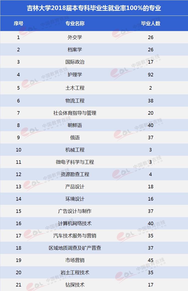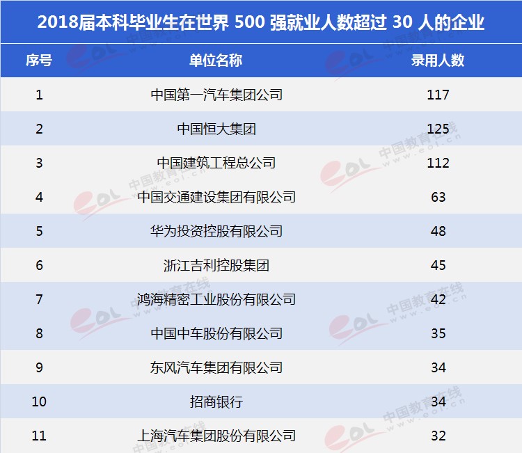 吉林大學2018屆本科畢業(yè)生9960人,就業(yè)率為94.22%。在就業(yè)人數(shù)超過 30 人的世界 500 強企業(yè)共有 11 家,以中國第一汽車集團公司(117人),中國恒大集團(125人),中國建筑工程總公司(112人)等企業(yè)為主。