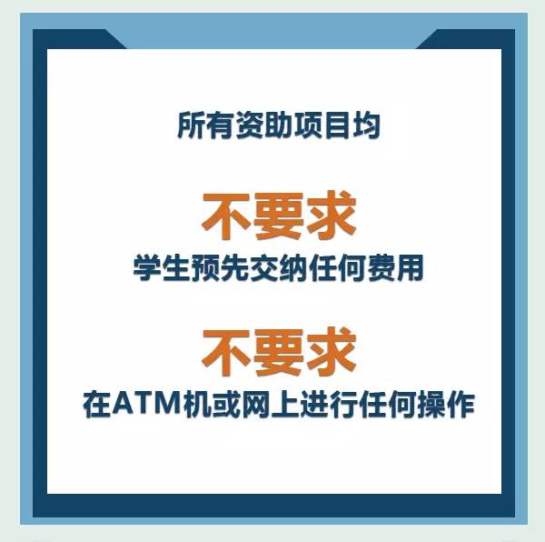 全國(guó)學(xué)生資助管理中心提醒廣大學(xué)生及家長(zhǎng):所有資助項(xiàng)目均不要求學(xué)生預(yù)先交納任何費(fèi)用,不要求在ATM機(jī)或網(wǎng)上進(jìn)行任何操作。如有類似要求的,千萬(wàn)不要相信,以免上當(dāng)受騙。