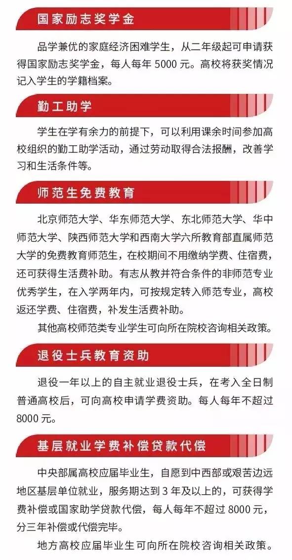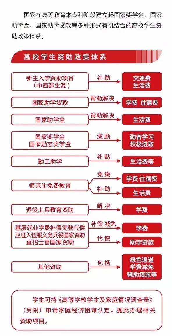 目前,我國(guó)已經(jīng)建立起以政府為主導(dǎo),學(xué)校和社會(huì)積極參與的覆蓋學(xué)前教育至研究生教育的資助政策體系。不論是學(xué)前班的娃娃,還是戴著紅領(lǐng)巾的小學(xué)生,不論是發(fā)奮讀書(shū)的初中生、高中生還是風(fēng)華正茂的大學(xué)生,只要上學(xué)有經(jīng)濟(jì)困難,國(guó)家都會(huì)提供適當(dāng)?shù)膸椭?/span>確保不讓一個(gè)學(xué)生因家庭經(jīng)濟(jì)困難而失學(xué)。對(duì)于大學(xué)生而言,國(guó)家資助政策有獎(jiǎng)助學(xué)金、助學(xué)貸款、困難補(bǔ)助、勤工助學(xué)和“綠色通道”等資助措施,保障他們?nèi)雽W(xué)前、入學(xué)時(shí)、入學(xué)后都不用愁。