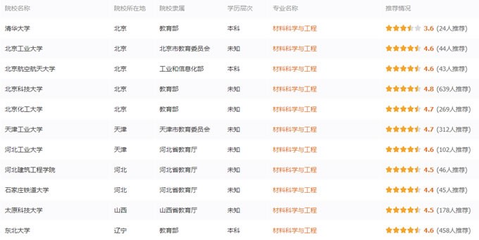 推薦專業源自高校學生實名推薦數據。當前累計投票數量超過427萬人次。通過實名注冊的高年級學生或畢業生,根據本校各專業辦學情況進行投票,推薦優勢專業或特色專業。下圖僅展示了部分高校的材料科學與工程專業的推薦情況,星號為推薦指數。