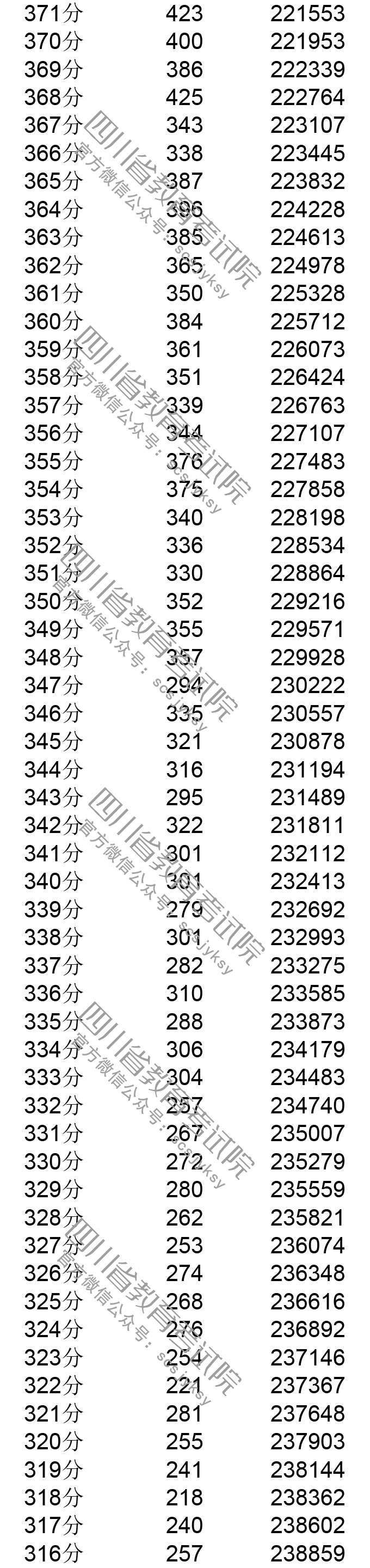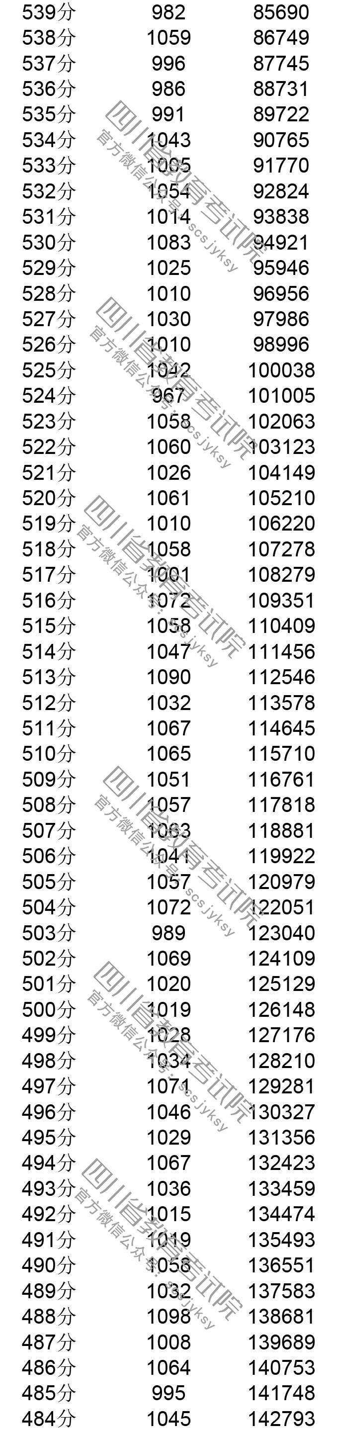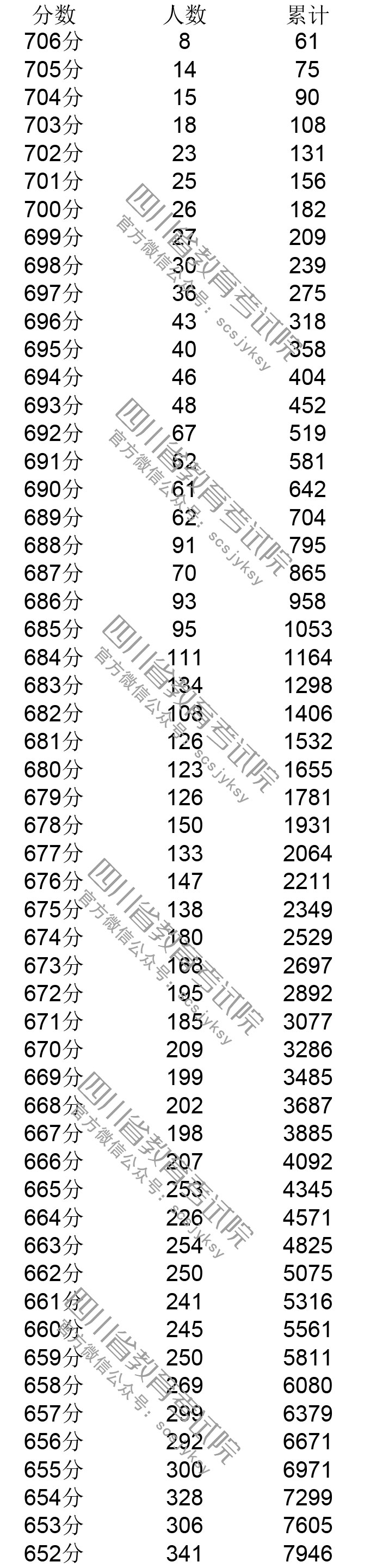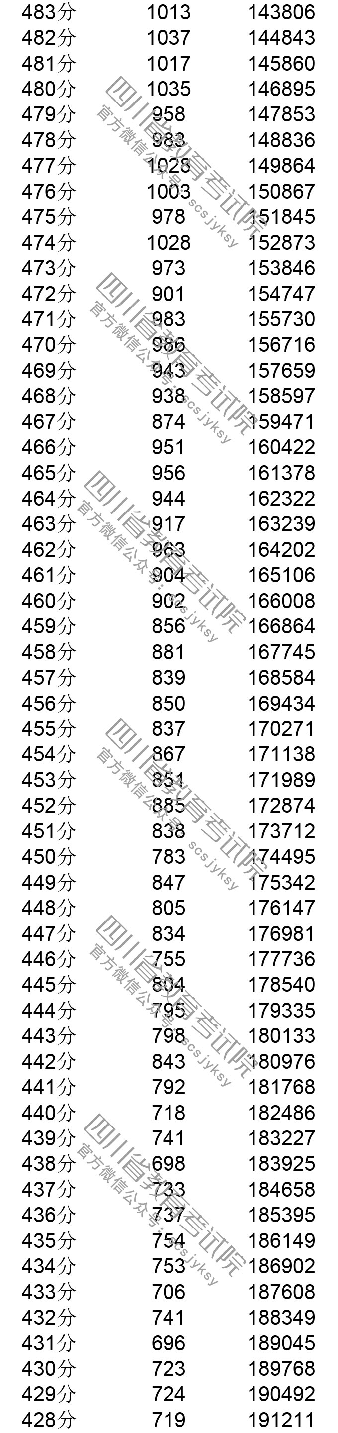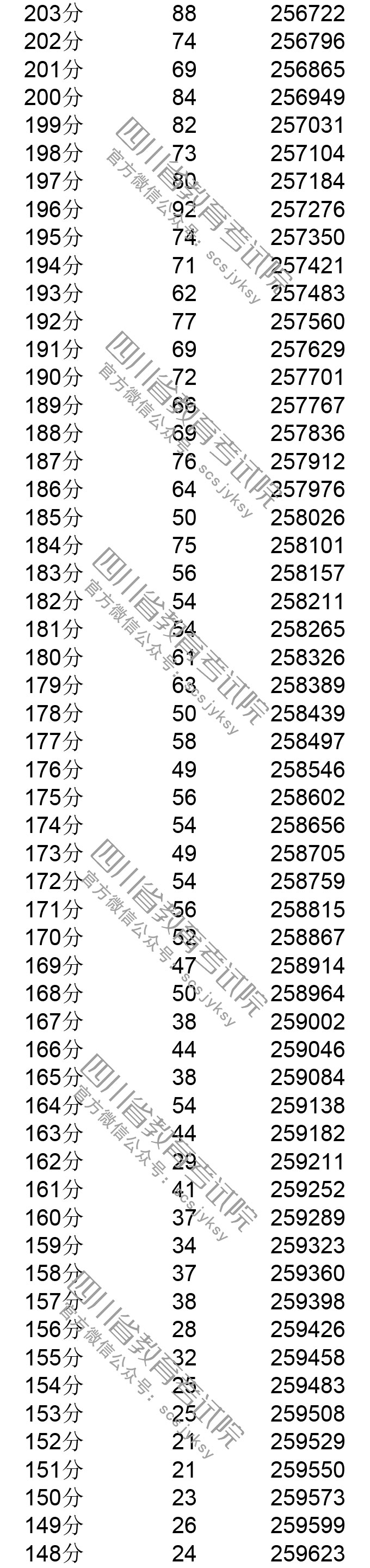四川省2019年普通高考理科成績分段統計表