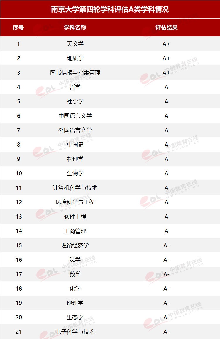 在教育部2017年公布的全國第四輪學科評估結(jié)果中,南京大學共有21個學科進入A檔。其中3個一級學科評為A+、11個一級學科評為A、7個一級學科評為A-。