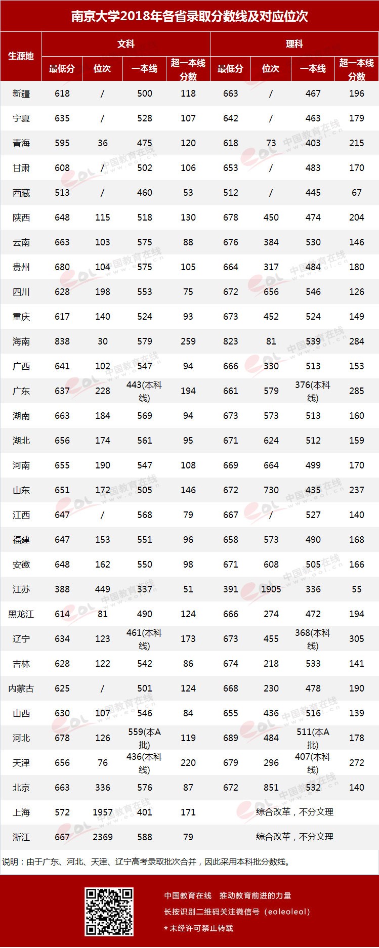 2018年,南京大學從錄取最低分高出重點線分值統(tǒng)計來看:文科有16個省份的錄取最低分超重點線100 分及以上;理科20個省錄取最低分超重點線150 分及以上。在江蘇省文科錄取最低分為388分,省內(nèi)排名449位,超出重點線51分;理科錄取最低分為391分,省內(nèi)排名1905位,超出重點線55分。