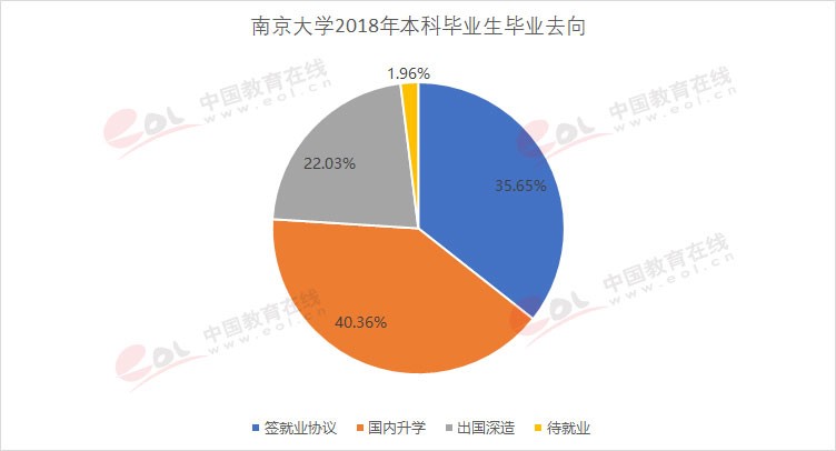 南京大學2018本科畢業(yè)生3047人,就業(yè)率為98.04%;畢業(yè)生畢業(yè)去向以升學為主,深造率達62.32%,其中國內(nèi)升學比例為40.36%,出國(境)深造比例為21.96%%;參加工作的占35.65%。
