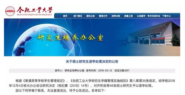 據中國青年報報道,2018年合肥工業大學曾對46名碩士研究生予以退學處理,原因包含未經請假離校超過兩周等。