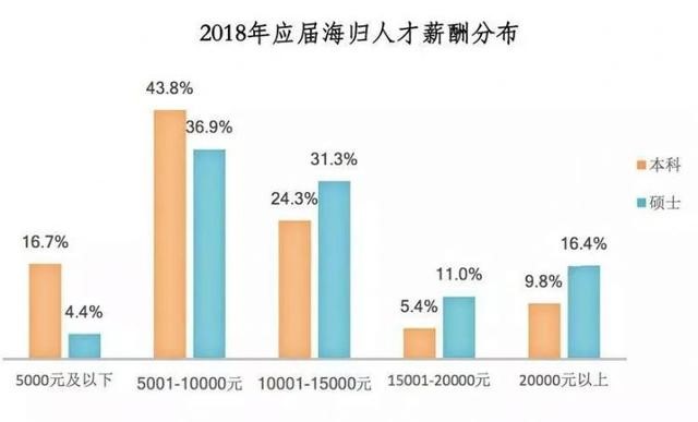 本科碩士畢業回國的留學生的薪酬主要集中在5000-15000元,本科達到2萬以上薪酬的占9.8%。碩士畢業回國的留學生薪酬達到2萬以上的是16.4%,79.2%畢業生薪酬在5000-15000元之間。