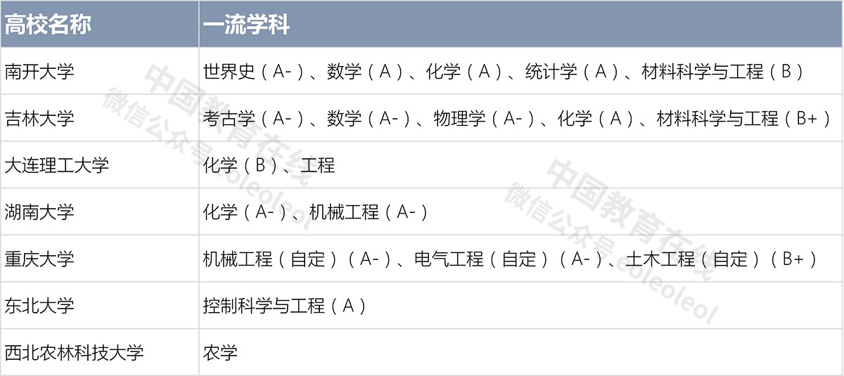 中國傳媒大學、中國地質大學、北京科技大學、北京林業大學、南京林業大學、中國石油大學、中國礦業大學、江南大學、北京協和醫學院、北京中醫藥大學、中國美術學院分別有2個學科入選A+。